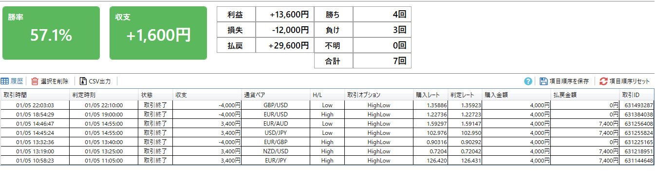 本日:7戦4勝3敗、勝率57.1%、+1,600円